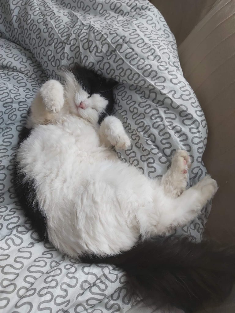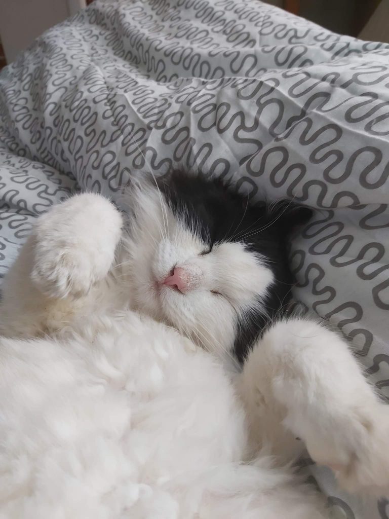 Det är nu över 2 år sedan jag hämtades från katthemmet. Jag har blivit familjens centrum. Matte är så glad att det var just mig de valde. Då, mager och sårig. Nu, något extra kilo att bära. För jag är så matglad. Och det kan man förstå. Jag var upphittad i Mellbystrand och där fick jag själv stå för maten. Matte undrar hur jag klarade mig. Jag som alltid är först till köket när familjen styr sina steg dit. Och ingen som hjälpte mig att reda ut tovorna därav såren. Nu tar familjen fram kammen då och då fast det inte är mitt största nöje. Så ibland bär det av till frisören. Matte är förundrad hur mycket kärlek en katt kan väcka och tacksam att jag fick bli en del av familjen.
