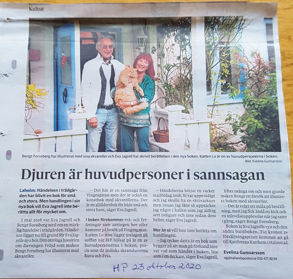 I pandemin kan det vara skönt att läsa en bok och mysa i soffan under kyliga dagar och vi har tips pÃ¥ en bok nämligen ”Den otroliga historien om duvungen Fröjd”. Det är sannsagan frÃ¥n Laholm, som aldrig kommit till utan den röda katten Lo! I boken möter du bÃ¥de fyrbeningar och tvÃ¥beningar och allt har verkligen hänt. För varje bok gÃ¥r 10 kr till oss (Kattfotens katthem)! Du kan köpa den i Bokhandeln och Wilda Ekologiskt i Laholm, pÃ¥ nätet eller beställa den i din egen bokhandel. Enklast är att swisha 140 kr till 0703-32 56 45 (Eva Jagrell). DÃ¥ skickas boken direkt till dig och portot är inräknat. Uppge namn och adress. Du kan ocksÃ¥ hämta boken i brevlÃ¥dan pÃ¥ Vingesgatan 6 i Laholm. DÃ¥ kostar boken 110 kr. Ring numret ovan för att göra en beställning. Tack till Eva Jagrell och Bengt Forsberg för att ni skänker 10 kr per bok till oss! ???