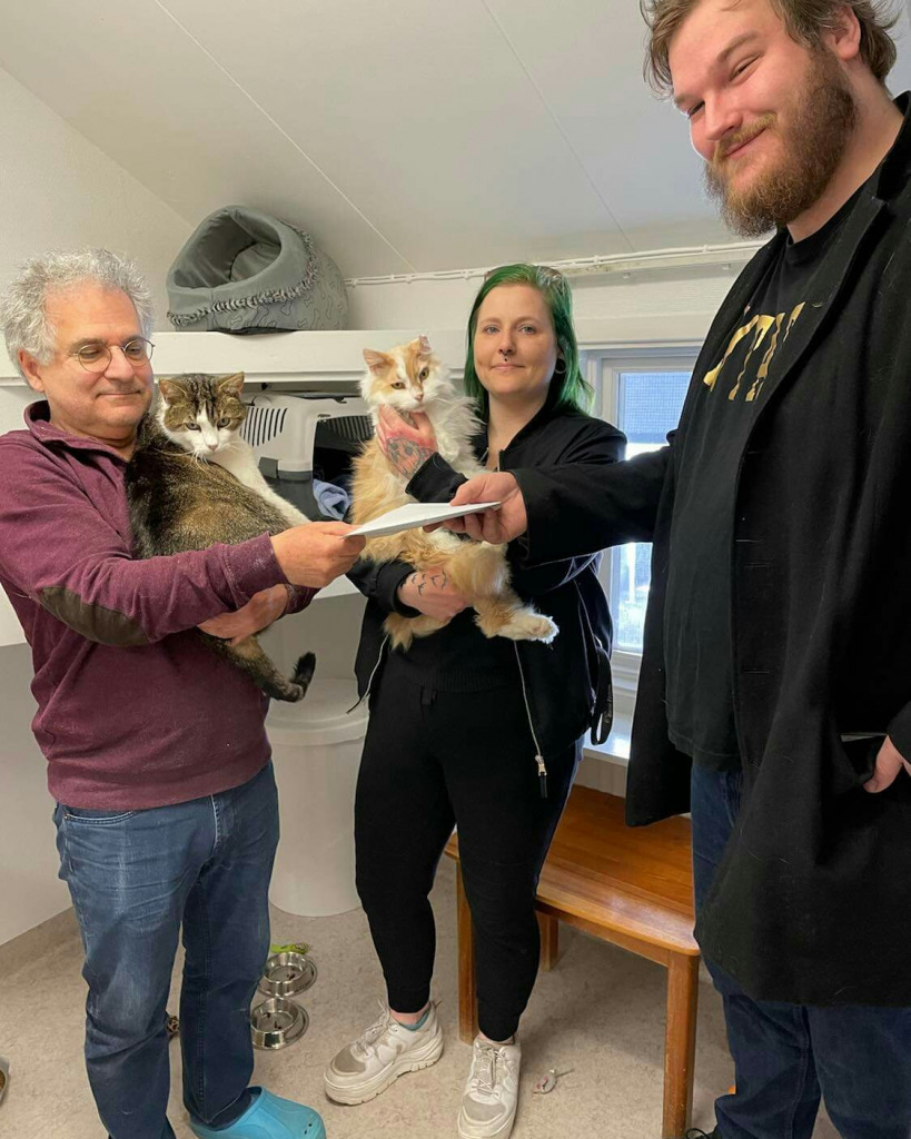 Ord kan inte beskriva hur mycket det betyder för oss! Här nedanför tas donationen emot av Grållis och Moje (som nyfiket nosar på kuvertet!) ![]()