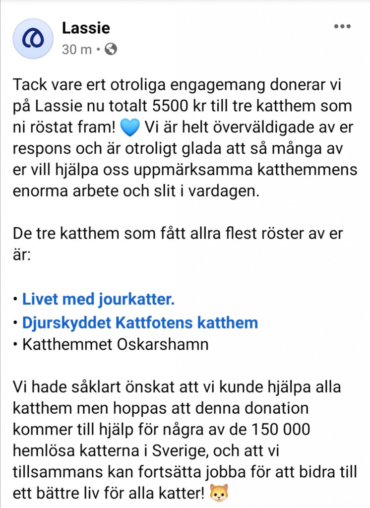 Delar med oss av de glada nyheterna! Vi var ett av de tre katthem som fick flest röster och är så tacksamma över att vi får äran att ta emot bidrag från Lassie! ?? Vi vill även ge ett stort tack till alla som röstade! ??❤️