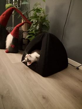 Yoda här, jag adopterades tillsammans med min bror Bumblebee 2013. Jag var väldigt skygg i början och gömde mig nästan i två veckor i en klösmöbel som mitt adoptivhem hade köpt. Efter ett tag började jag komma fram och vänja mig vid min nya familj. Nu är jag världens kelgris och sitter gärna med min familj i soffan på kvällarna. När de adopterade mig trodde personalen på Kattfoten att jag skulle trivas bäst som innekatt, men när vi flyttade ut på landet fick jag prova att vara ute. Nu 4 år senare är jag ute hela dagarna på våren och sommaren. Och en sak är säkert, min familj behöver aldrig vara oroliga över att försova sig, för nästan prick 05:30 varje morgon, går jag in i sovrummet och jamar! Jag är fortfarande skygg mot de som jag inte känner igen eller om det är mycket folk hemma, men när du väl vunnit mitt förtroende är jag helt underbar!