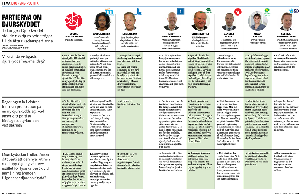 Tidningen Djurskyddet har genomfört en enkät där varje parti svarar på var de står och vad de tänker göra i tio viktiga djurskyddsfrågor.