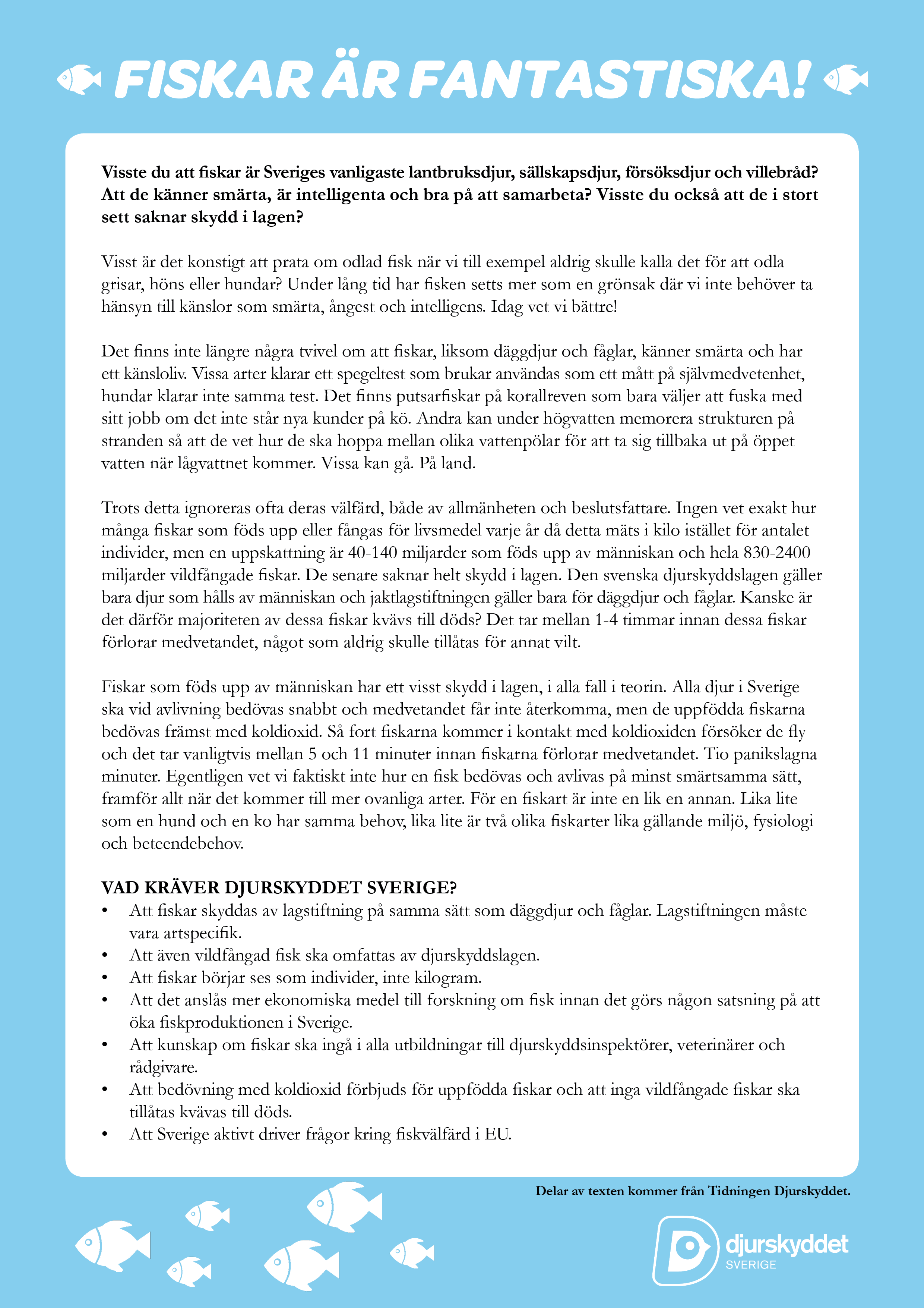 Visste du att fiskar är Sveriges vanligaste lantbruksdjur, sällskapsdjur, försöksdjur och villebråd? Att de känner smärta, är intelligenta och bra på att samarbeta? Visste du också att de i stort sett saknar skydd i lagen?