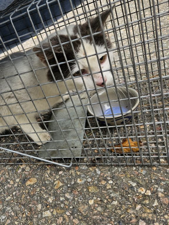 Efter att fällan riggats under trädet vid containrarna så var hon fast efter inte ens 1 timme, hon var så hungrig efter att spenderat hela sommaren ute, vilse och ensam.