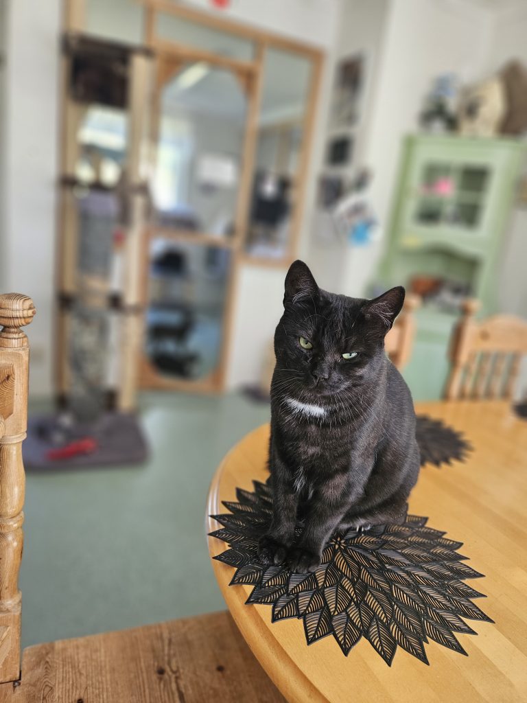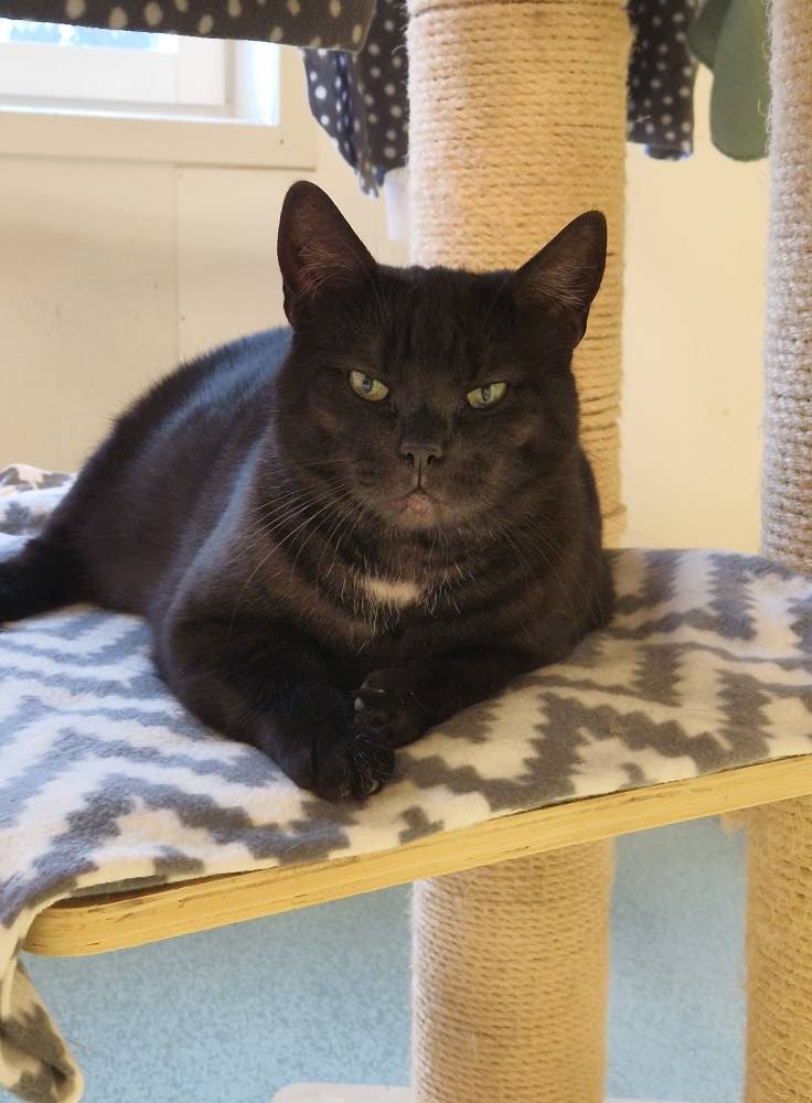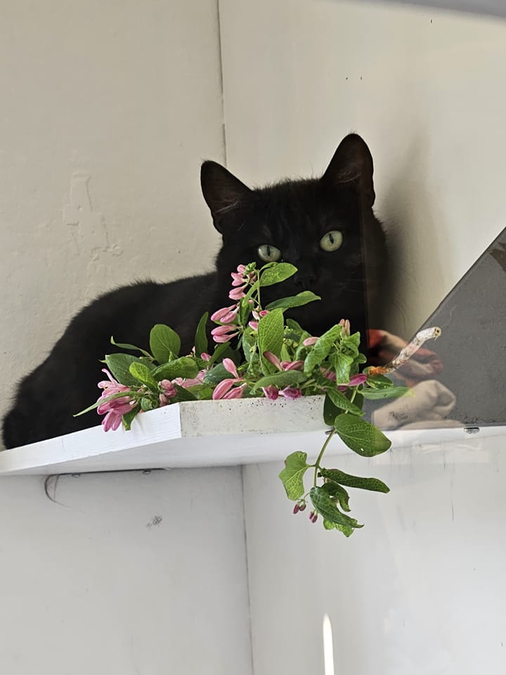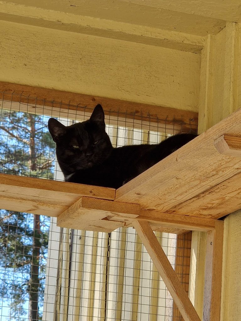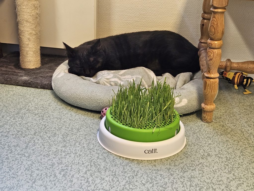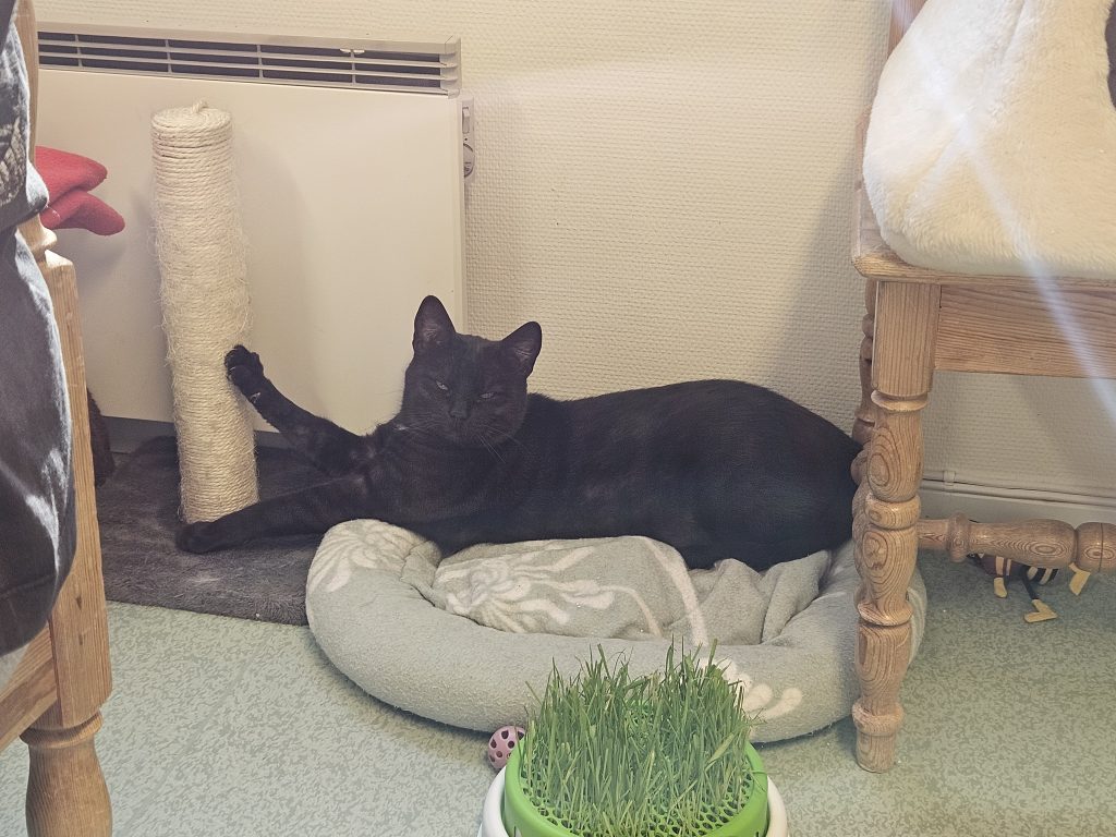 På morgonen är det oftast Askari som möter personalen i dörröppningen, han sitter gärna först på kö i köket när vi häller upp blötmaten till katterna, han vill då ha en egen skål medans vi delar ut de andras för att vänta är inte riktigt hans grej. Han vill gärna mysa men vågar inte riktigt göra det med oss även om han har börjat nosa på våra händer och man får försiktigt stryka honom, så han stryker sig gärna mot de andra katterna istället. Han söker gärna upp de andra katterna i katthemmet för att mysa så vi vill att han får en kompis i sitt nya hem.