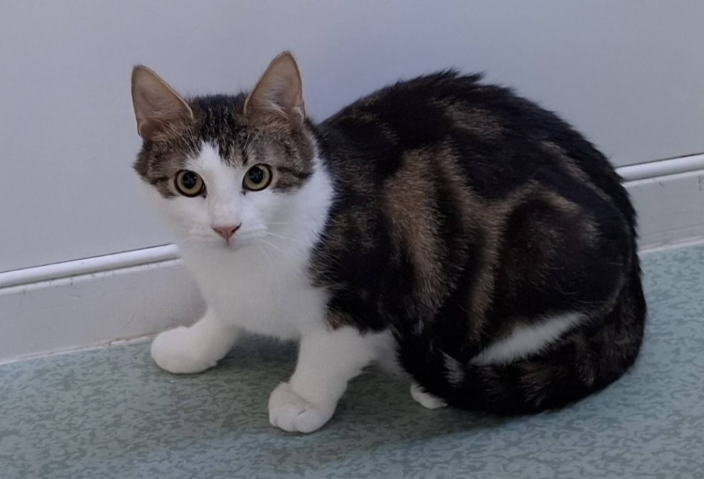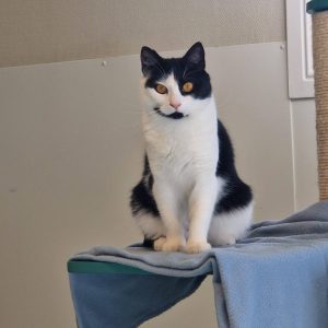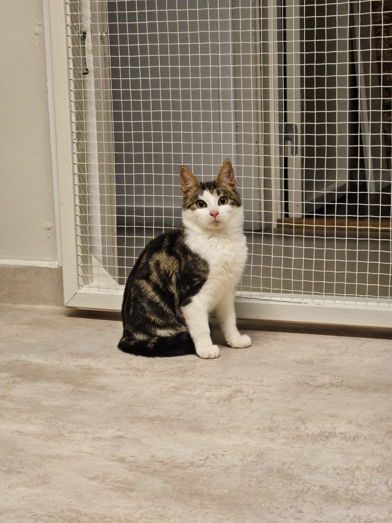 Han är en rädd kille på snart året, har under sin tid hos oss blivit tryggare men backar ännu undan när man kommer för nära.