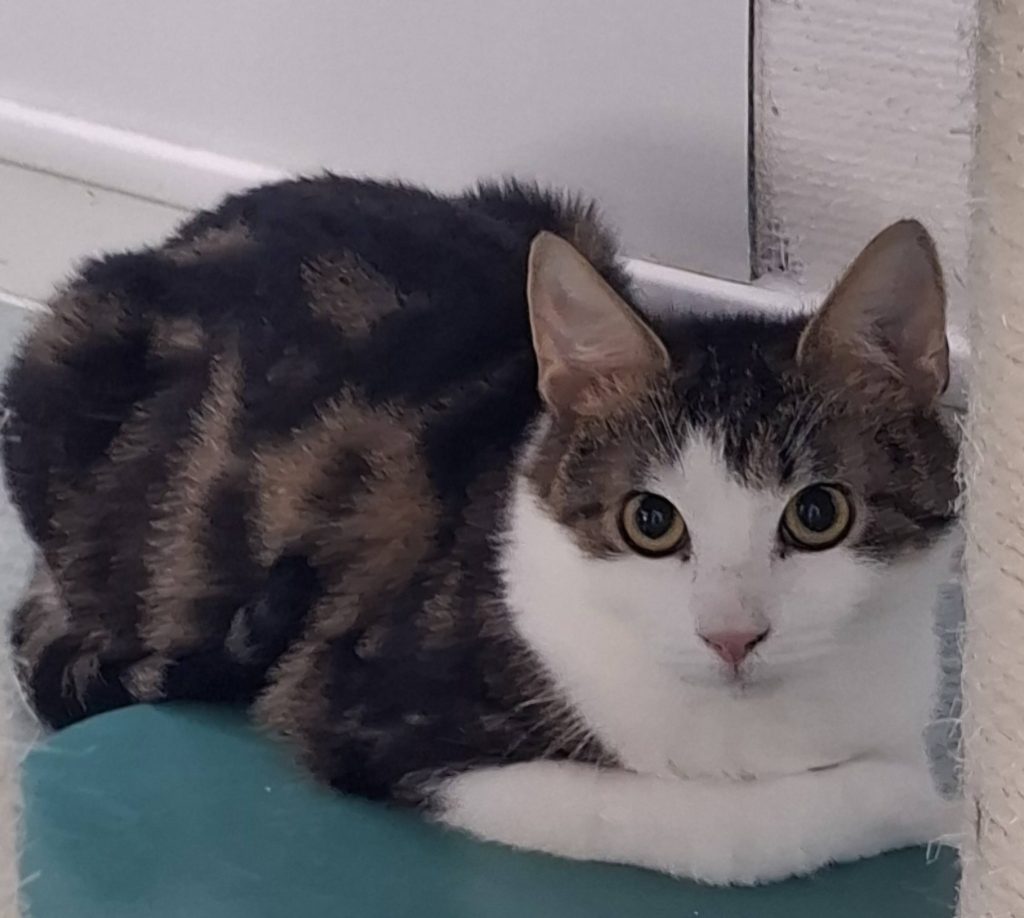 Han är en rädd kille på snart året, har under sin tid hos oss blivit tryggare men backar ännu undan när man kommer för nära.