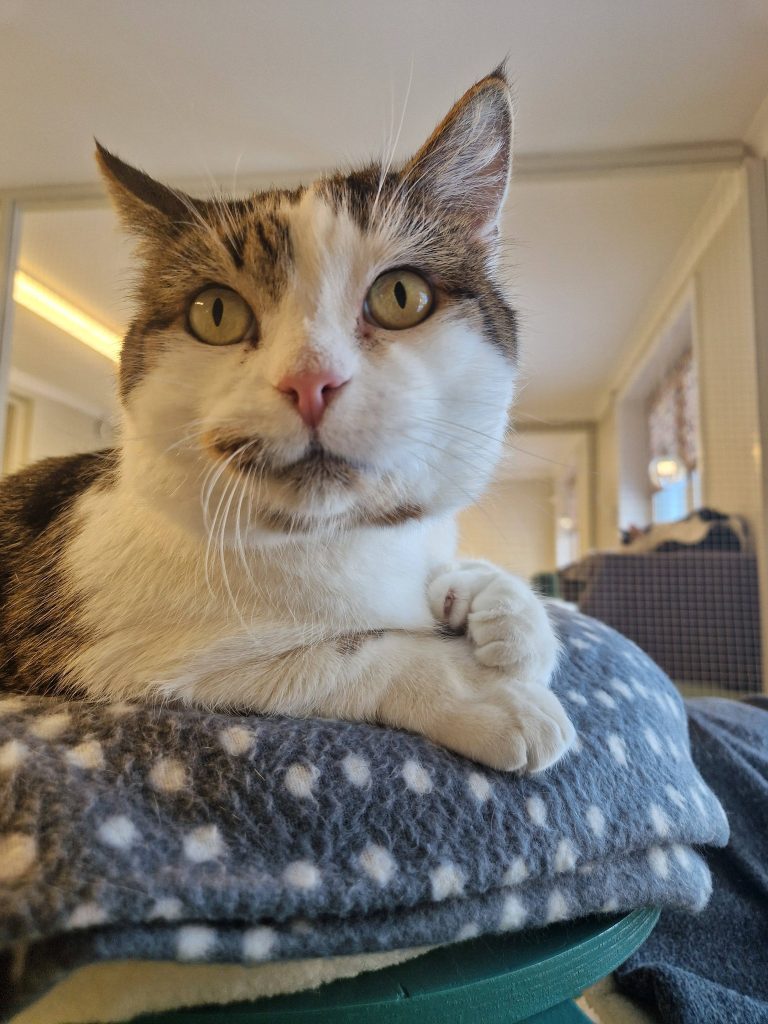 Ozzy har alltid varit innekatt, han är en mycket nyfiken och social kille. Väldigt aktiv och pratar gärna. Han kan vara lite hårdhänt mot andra katter men har funnit en vän hos oss i Muffin.