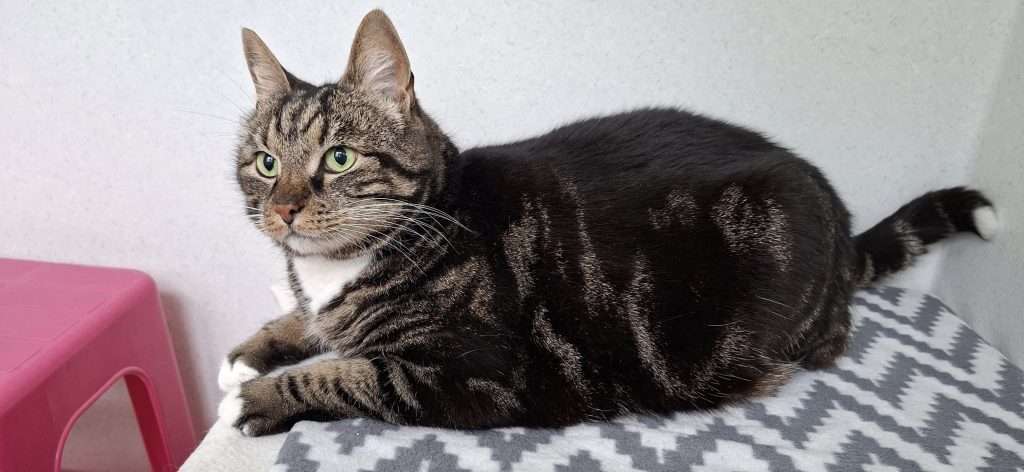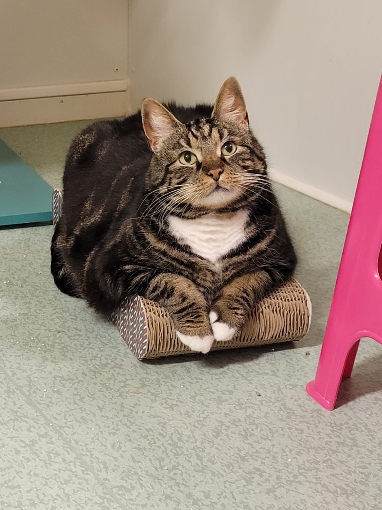 Simba älskar mat vilket syns på hans kroppshydda, han är tyvärr väldig överviktig och behöver hjälp att kolla ner i en mer kattvänlig vikt för att han i det låter loppet ska ha ett bra och hälsosamt liv.