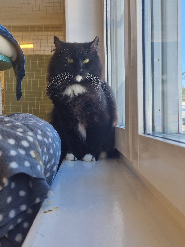 Trulle är väldigt försiktig av sig, han sitter gärna i fönstret och tittar ut men vill ännu inte ha någon större kontakt med oss volontärer. Han gillar kattgodis så vi tror att vägen till hans hjärta är genom godsaker så vi jobbar vidare med att vinna hans tillit.