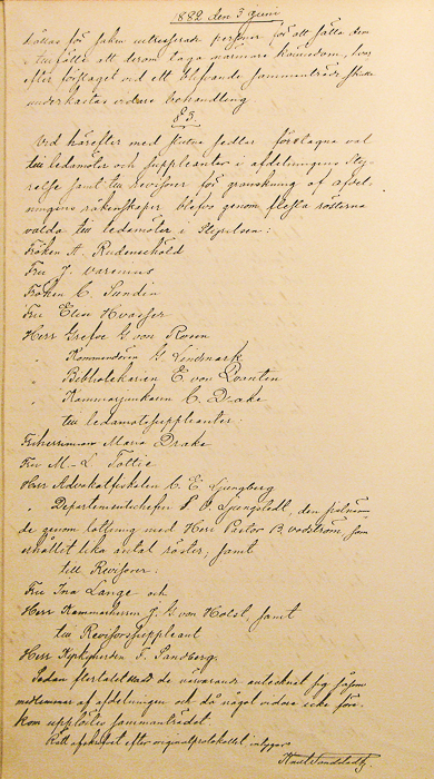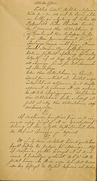 Första sidan i protokollet från föreningens bildande den 3 juni 1882. Protokollen t.o.m. 1956 har folioformat. De tidiga protokollen är förstås prydligt handskrivna.