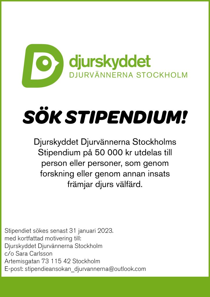 Vid föreningens 100-årsjubileum 1982 instiftades ett stipendium att utdelas till ”person eller personer som genom forskning eller annan insats främjar djurs välfärd”. I statuterna står också att sökande, vars arbete främjar djurs välfärd i Stor-Stockholmsområdet, ska ha företräde framför annan sökande.   Föreningens styrelse utser stipendiat. Stipendiet, eller stipendierna om flera personer utses, ska utgå med det belopp som styrelsen beslutar med hänsyn till föreningens ekonomiska ställning. De senaste åren har stipendiets storlek varit 25 000 – 35 000 kr. Från och med 2022 har det fattats beslut om att höja stipendiet till 50 000kr för att ytterligare bidra till djurs välfärd. Stipendiet annonseras varje år, vanligen i december, i tidningen Djurskyddet, Svensk Veterinärtidning samt på Sveriges Lantbruksuniversitet (SLU) i Uppsala och Skara. Under de senaste åren har följande ansökningar belönats:
