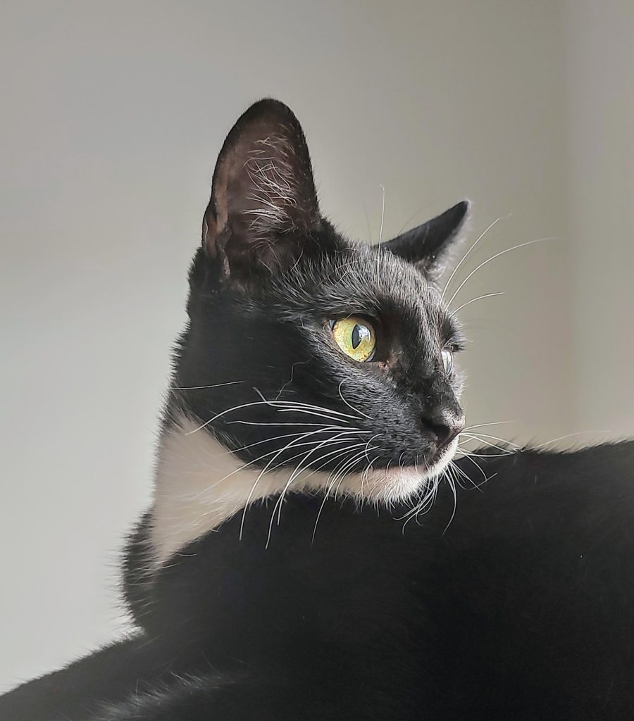 Som kattunge levde han i ett stall tillsammans med sin syster men utan särskilt mycket mänskligt sällskap, därför är han nu noga med att gos gärna får ske på hans egna villkor. Han har trots detta ändå visat sig väldigt sällskaplig och kan njuta av både klappar och att bli buren. Det man bör tänka på är dock att han är en ung katt och en gosig stund slår lätt över i lek, något som kanske hade kunnat skrämma väldigt små barn.