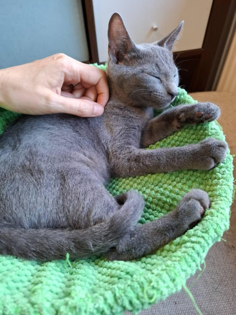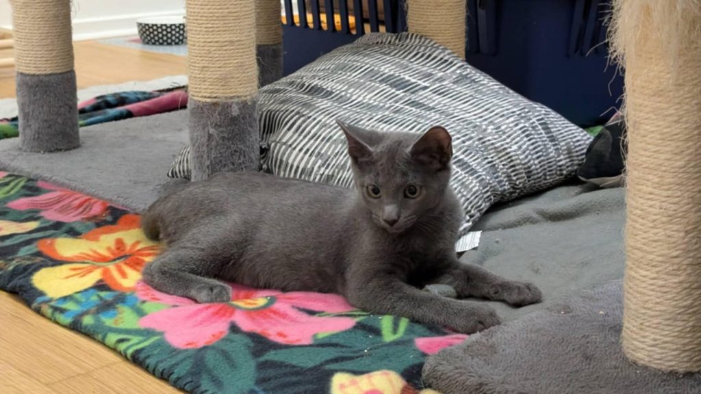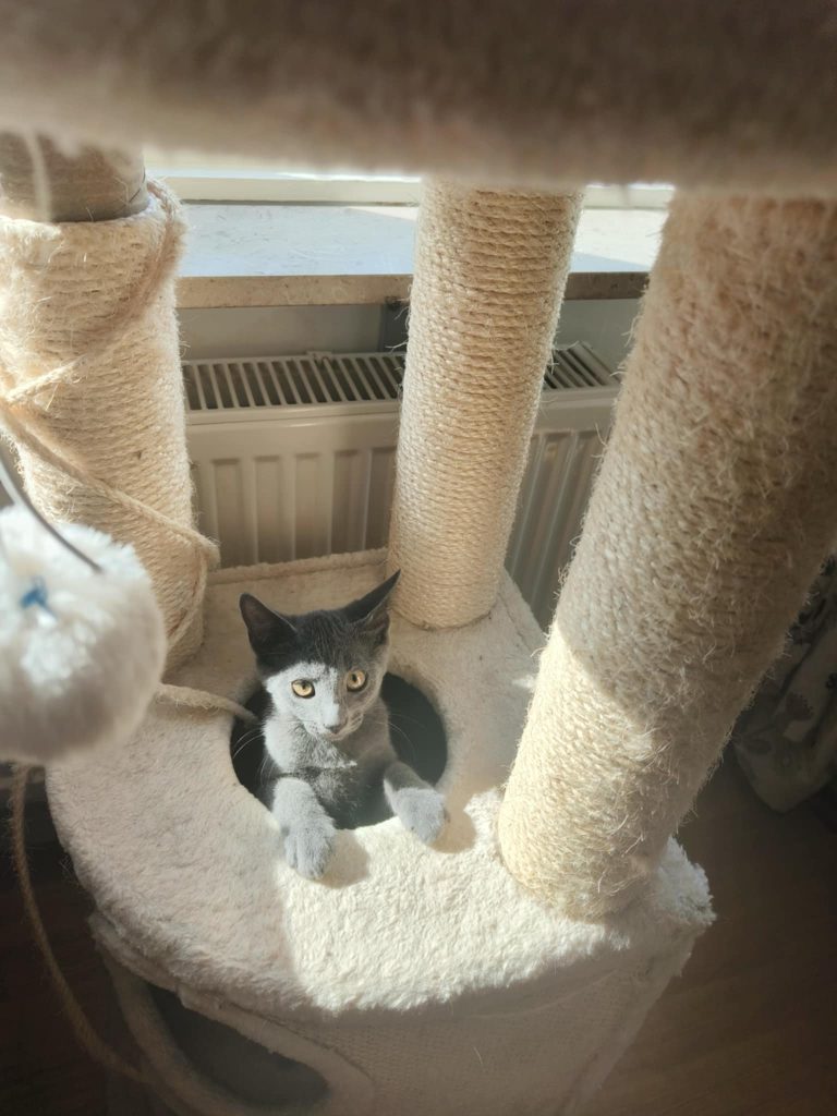 Hon älskar att rusa runt med sina syskon, jaga snören och fjädrar i full fart, och när det är dags att varva ner hittar man henne ofta högt upp i klösträdet, där hon gärna kopplar av en stund.
