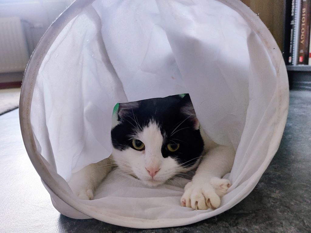 Calvin kom till sitt jourhem i våras efter att han hittats hemlös i Landskrona. Tyvärr är hans bakgrund okänd, men det är uppenbart att han haft ett hem då han är både renlig och orädd. Han accepterade jourhemmet som sitt eget redan vid första inspektion, och har aldrig känt ett behov av att gömma sig, såvida inte dammsugaren åkt fram.