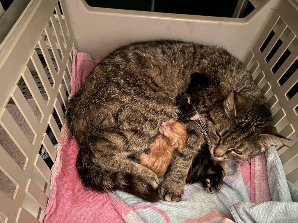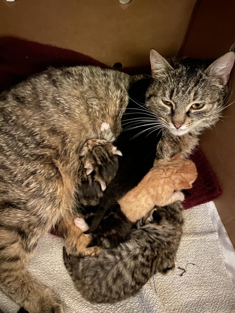 Wilma matades och gavs skydd under vintern av en vänlig dam och började återfå sitt förtroende för människor när det i april visade sig att hon blivit väldigt rund om magen. Vi blev då kontaktade och hon hann precis in i värmen och tryggheten i jourhemmet innan hon efter ett par daga födde sina 5 fina kattungar som nu är redo för nya äventyr och så då även Wilma.