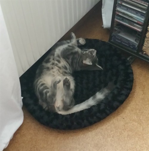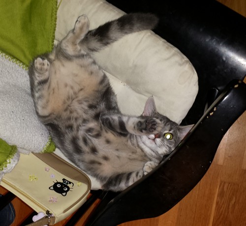 Han är redan en riktigt mysig katt med mycket egna vanor, sover i vår säng, på morgonkvisten kryper han upp och lägger sig på huvudkudden och spinner väldigt högt till dess vi vaknar.