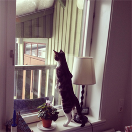 När han inte leker med Alfons eller gosar med mig så tycker han det är väldigt spännande att sitta på fönsterbrädan & spana på fåglar, ibland pratar han med dom 🙂