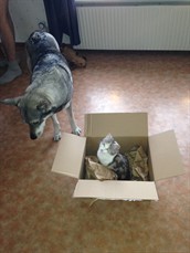 Han funkar jättebra med barnen och är väldigt gosig med både dom och Örjan och mig. Han har bra aptit och tycker mycket om rester som älgkött och fisk.