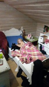 Hon vill fortfarande inte att vi lyfter upp henne men hon gillar att vara nära och ligga och mysa! I alla möjliga och omöjliga ställningar som synes på bilderna! 😉