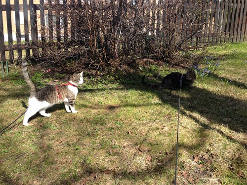 Han går ut och in genom kattluckan som han vill och är ute mer och mer. När han kommer in så berättar han det högljutt och då vill han ha både mat och kel.