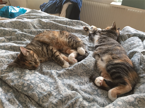 De har funnit sig väl tillrätta och båda är väldigt sociala och kontaktsökande nu, även om Victoria fortfarande är den som är mest på. De äter och verkar må fint.