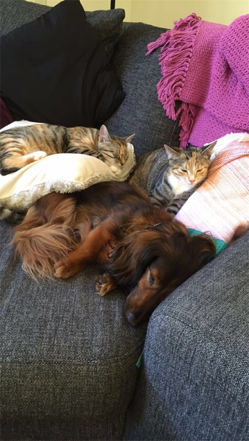 Hobbe trivs bra med mig och katten Mitzi. Nu får jag till och med lyfta upp han i famnen och han älskar att bli kliad på magen.