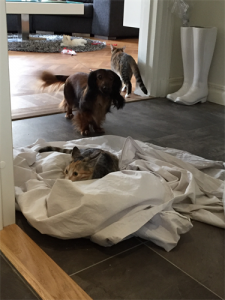 Fenrice fick ett nytt namn, Jussi. När han vill leka å katten Sammi är lite seg i starten , så går tonläget från plingelingljud till en grov hög ton. Jussi Björling var ju en tenor.