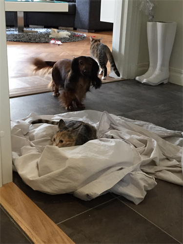 Vi trivs så bra i vårt nya hem och styr och ställer med både matte, husse och storasyrran Unni (tax).
