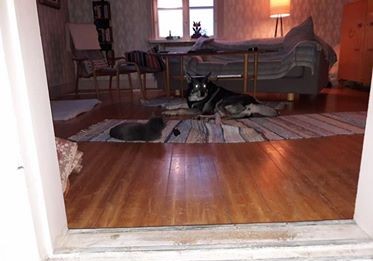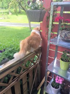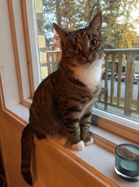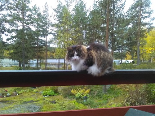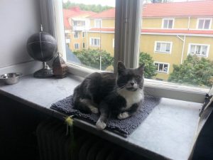 Hej! En midsommarhälsning från Maj (Hagar) som provat på utelivet. Hon är en underbar katt-tjej! Fortfarande försiktig och lite skygg på dagarna, men supergosig och mysig kvällstid. Sover nu med oss i sängen varje natt, busar lite för hårt med Sigge ibland och blir tillrättavisad av honom. Mkt nyfiken på vårt ”dagbarn” jämthunden Sakko, som hon gärna delar rum med på nätterna. Vi är så glada över att ha Maj hos oss!