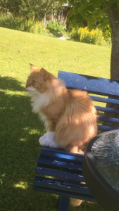 Hej! Tänkte bara berätta att Charlie har det jättebra hos oss. Det känns som om han varit hos oss länge fastän det bara är några månader. Han är otroligt snäll och kärvänlig. Han trivs bra ute och håller sig mest på tomten och grannens tomt och är gärna nära oss. Grannen är en barnfamilj och dom har också blivit kär i honom och har erbjudit sig att vara kattvakt vid behov. Dom kan inte ha en egen katt eftersom minsta pojken är allergisk. Första veckorna klarade han inte av stängda dörrar utan krafsade och jamade så det var bara att ha alla dörrar öppna i huset. Men sen han har fått börja vara ute har krafsandet helt upphört. Han krafsar inte ens om han inte får gå ut.