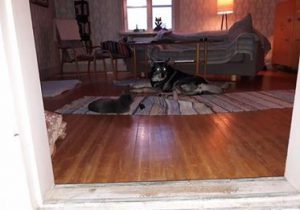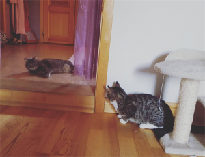 Jag har insett att hon verkligen inte är döv, men verkar ha svårt att lokalisera varifrån ljud kommer. Hon reagerar när man ropar på henne och på andra ljud, men kan ibland vända huvudet åt fel håll varifrån ljudet kommer… Hon är rent allmänt lite förvirrad och med lite dåligt självförtroende, men det blir bättre och bättre med tiden!I hallen finns en spegel från golv till tak, och första och andra natten satt hon framför den och jamade högt och stirrade på sin spegelbild. Hon hade väldigt svårt att förlika sig med spegeln och verkade bli väldigt orolig av den, kunde inte slappna av alls. Så jag täckte för den med tidningspapper som jag inte ämnar ta bort, och nu har hon glömt den…
