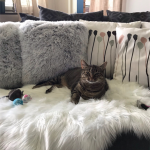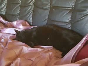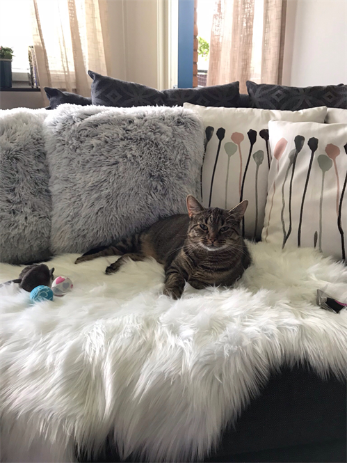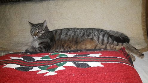 Sotis har funnit sig väl till rätta. Leker med råttan och tar en vilopaus på soffan. / Gunnar & Chatrin, Karbäcken Hoting