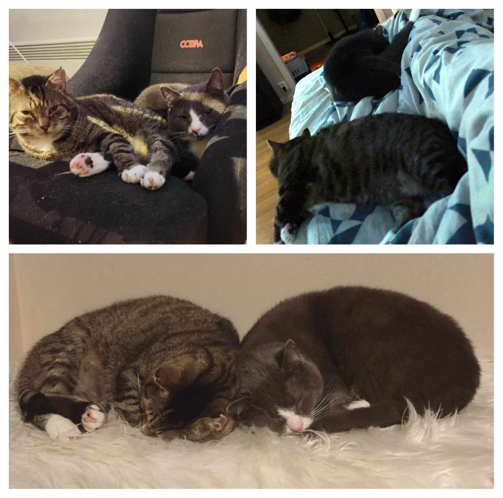 ”Roi-Boss och Bumbibjörnen har hittat sitt nya favoritställe att mysa ihop sig pÃ¥ nu. Roi-Boss ligger gärna antingen precis bredvid en i soffan och ibland kan han ligga i famnen om man ser till att inte sluta klappa han. När det kommer till Bumbibjörnen sÃ¥ gÃ¥r det sakta men säkert framÃ¥t; han har kommit fram tvÃ¥ gÃ¥nger själv och strykt sig emot mig och bett om gos men han är fortfarande väldigt skeptisk ifall man rör sig lite för fort. Annars sÃ¥ gÃ¥r det bra med han ocksÃ¥! Roi-Boss ligger gärna i sängen pÃ¥ kvällarna och gosar medans Bumbibjörnen har varit upp nÃ¥n gÃ¥ng men hoppar ner vid minsta rörelse.”