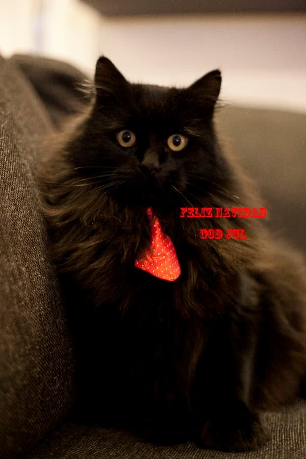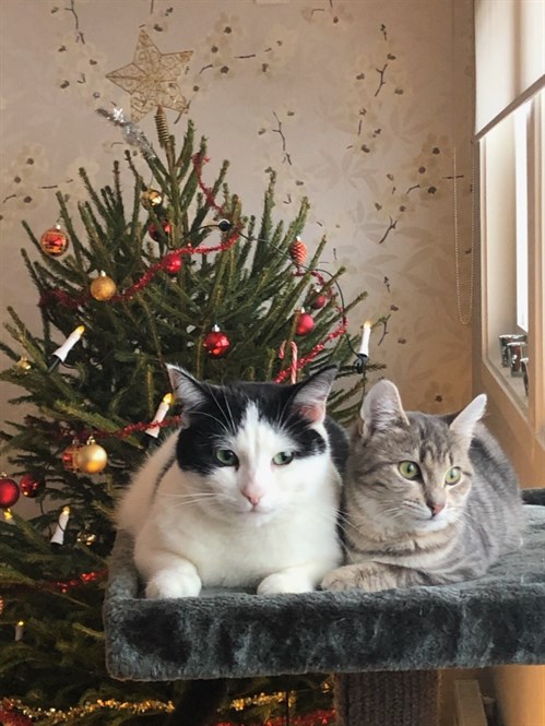 Hej! Här kommer en hälsning från Hobbe som varit i sitt nya hem 1 år och några månader och som trivs ypperligt med att gå ut en liten sväng emellanåt och ligga hos matte i sängen på nätterna. Ligga på skåpet mitt på duken är också bra. En av honorna, Mozza, som fanns här förut trivs jag väldigt bra med och får gosa med, men den andra, Cassandra verkar vara rädd för mig och morrar och fräser och håller sig helst undan. Vi härstammar ju båda från samma ställe i Offerdal så man kan säga att släkten är värst. Många julhälsningar från Hobbe och matte Eva.