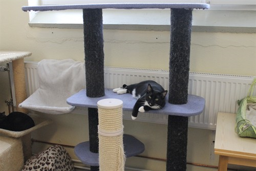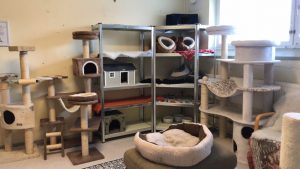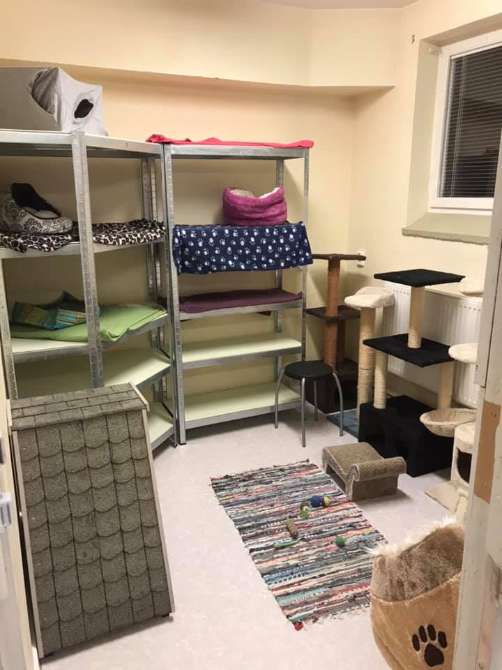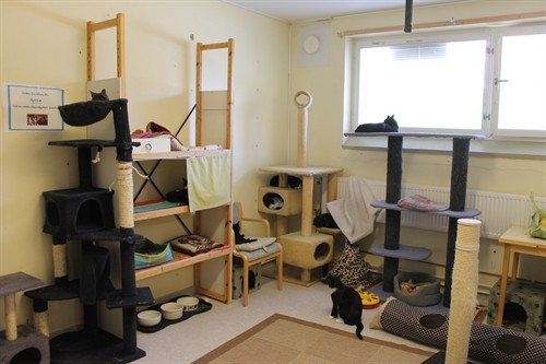 På katthemmet finns flera nätade smårum, utöver två större rum och två kök. Vi har försökt göra inredningen så hemlik som möjligt, både för katternas och vår egen trivsel.