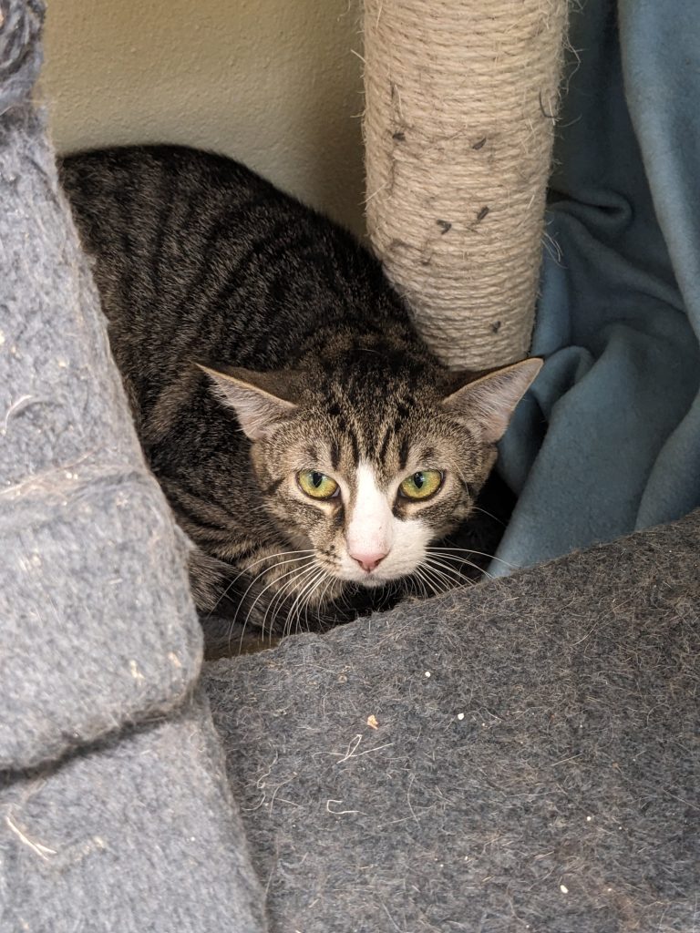 Stjärna fick en tuff start i livet. Hon föddes utomhus, utan närhet till människor, och bär därför med sig en naturlig försiktighet. Men bakom den där lite blyga blicken finns något väldigt fint. På katthemmet har hon gjort stora framsteg – små steg för världen, men enorma steg för en liten katt som håller på att lära sig att människor kan vara trygga.