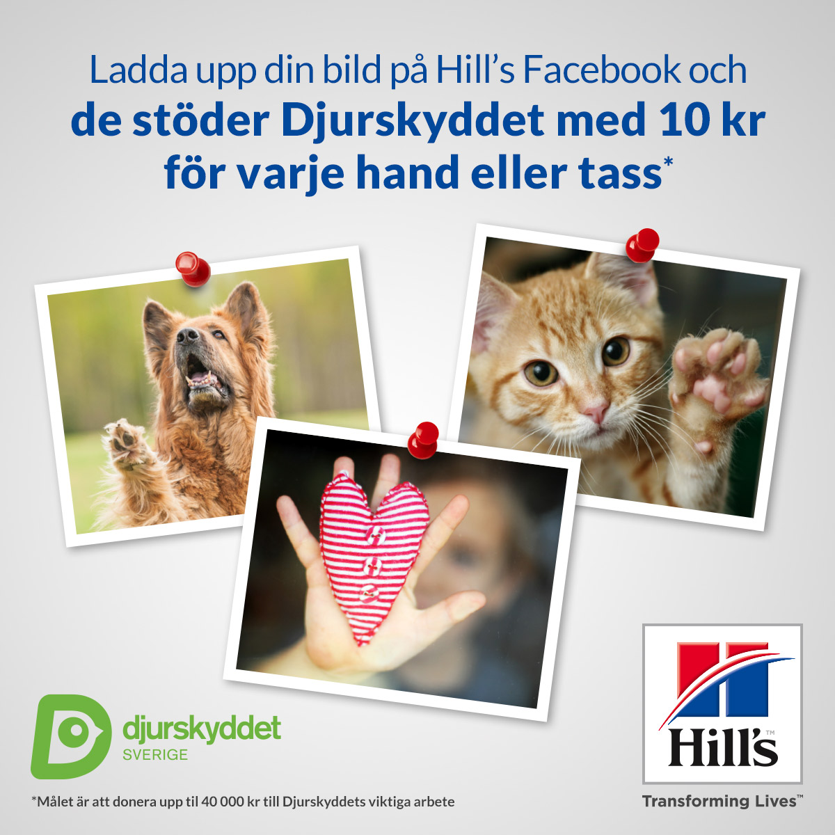 Du som är djurälskare uppmanas att ta en bild på din hand eller på en tass på ett djur och publicera på Hill’s Facebooksida. Du kan också dela din bild på Instagram under hashtagen #Gedinhand
