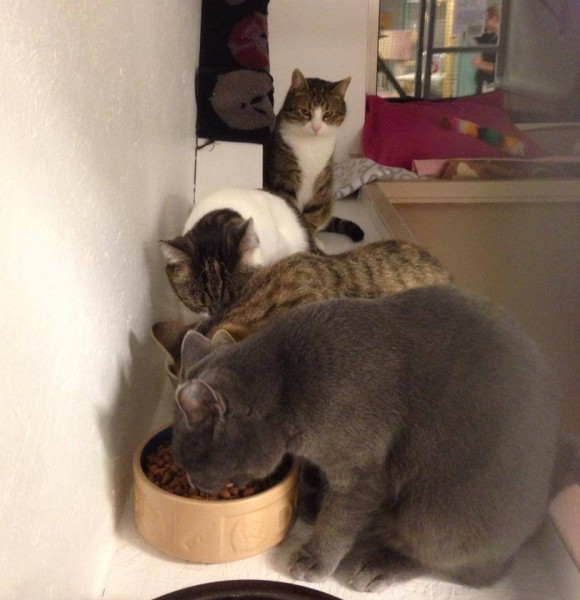 När en katt är redo att flytta ut i lokalen så introduceras den gradvis till de andra katterna på djurhemmet. I de allra flesta fallen går det bra för alla katterna att röra sig fritt bland de andra katterna på djurhemmet på dagtid, när djurhemspersonalen finns på plats. På kvällen går katterna in till ”sin” box (de flesta katterna bor tillsammans med någon eller några av de andra katterna på djurhemmet). De flesta av boxarna i lokalen har kattlucka ut till uteburar. Vi reglerar när katterna får gå ut/inte får gå ut, men på sommartid brukar katterna kunna vistas i uteburarna både dagtid och nattetid.