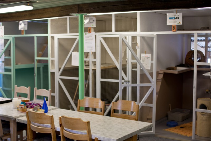 På vårt djurhem har vi i dagsläget fyra karantänboxar samt totalt åtta boxar i lokalen, där ett par av dessa utrymmen är lite större och har plats för fler katter.
