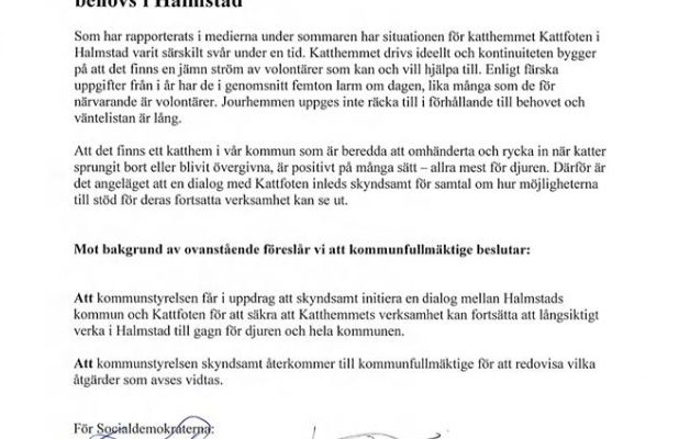 Efter den uppmärksamhet som Kattfotens katthem fått i media under det gångna året har nu även Socialdemokraterna i Halmstad insett att något behöver göras åt situationen. Därför har det...