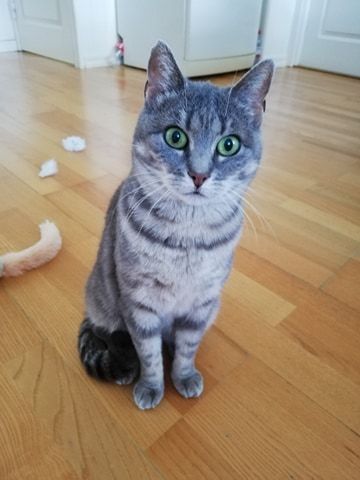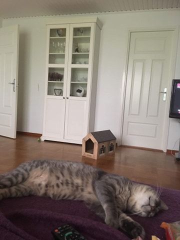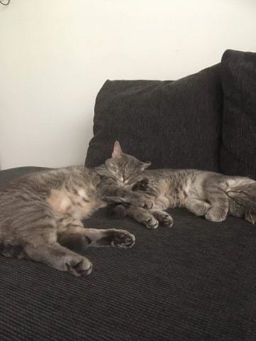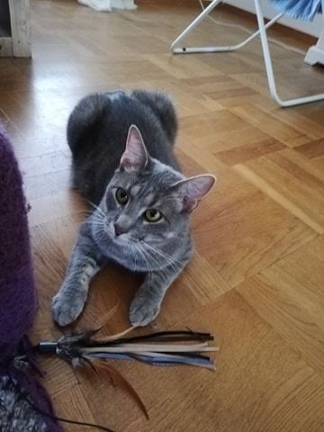 Vi har funnit oss tillrätta i vårt nya hem. På katthemmet hette vi Älvin och Ärlig, jag behöll mitt namn medan Ärlig fick det nya namnet Äbbe. Vi är nyfikna och keliga. Jag gillar att sitta på altanen och titta på grankatterna. Att jaga spindlar är med kul! Äbbe gillar att ta tupplurer och gosa.