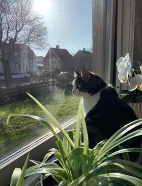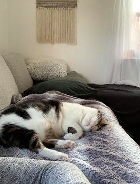 Jag är en otroligt mysig och kelen tjej! Matte säger att jag blir mer och mer gosig ju mer jag litar på en. Från att ha legat på andra sidan soffan när jag först flyttade in, till att lägga mig i mitten av soffan eller hoppa upp och lägga mig i knäet direkt någon sätter sig. Jag hänger med i alla rum och lägger mig och rullar runt på golvet i köket, i tid och otid. Har en förkärlek till mat och är totalt ointresserad av alla typer av leksaker. Man hittar mig troligtvis i en konstig sovställning i soffan eller ser att jag krupit ner under överkast och täcke i mattes säng.