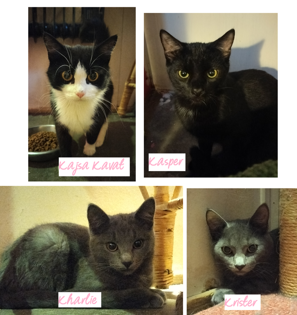 Mamma Kajsa Kavat och hennes tre barn söker hem! De vill gärna åka två och två då de står varandra väldigt nära. Försiktiga men nyfikna och snälla. Kajsa Kavat tycker om att bli klappad!