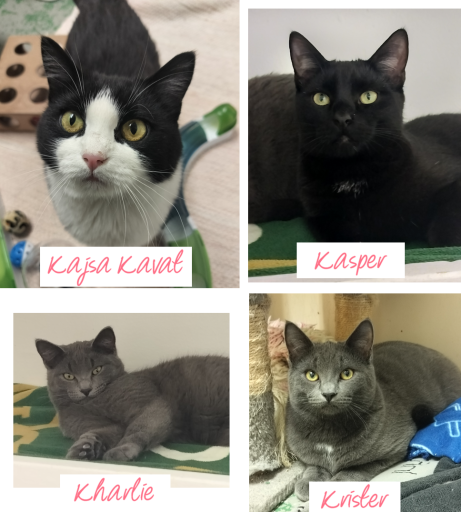 Mamma Kajsa Kavat och hennes tre barn söker hem! De vill gärna åka två och två då de står varandra väldigt nära. Försiktiga men nyfikna och snälla. Kajsa Kavat tycker om att bli klappad och barnen börjar bli nyfikna på det också!