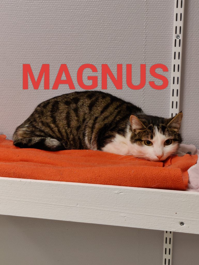 Magnus kom tyvärr tillbaka till djurhemmet pga att det inte fungerade i den nya hemmet. Han kom tillsammans med flera katter till djurhemmet i ett omhändertagandet via Länsstyrelsen i Värmland. Vi är väldigt blyga och försiktiga, vi går undan men är nyfikna och vill så gärna vara med. Alla katter som adopteras ut från oss, ungkatt till vuxen, är kastrerade (kattungar kastreras senare), ID-märkta/registrerade och vaccinerade