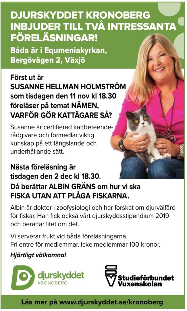 I november och december har vi två intressanta föreläsningar. Den första 11/11 om katter och den andra 2/12 om fiskar. Läs mer nedan.
