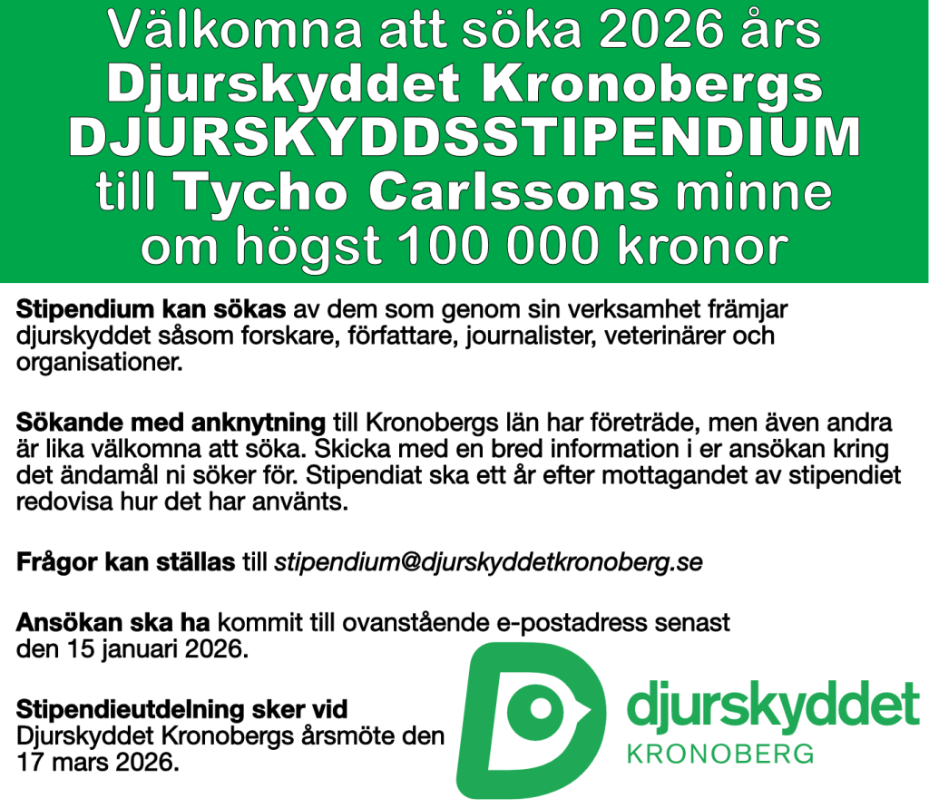 Nu är det dags att skriva en ansökan till Djurskyddet Kronobergs djurskyddsstipendium till Tycho Carlssons minne. Om du har något bra forskningsprojekt eller annat fint inom djurskyddsområdet kan du ansöka senast den 15 januari 2026. Se annonsen nedan.