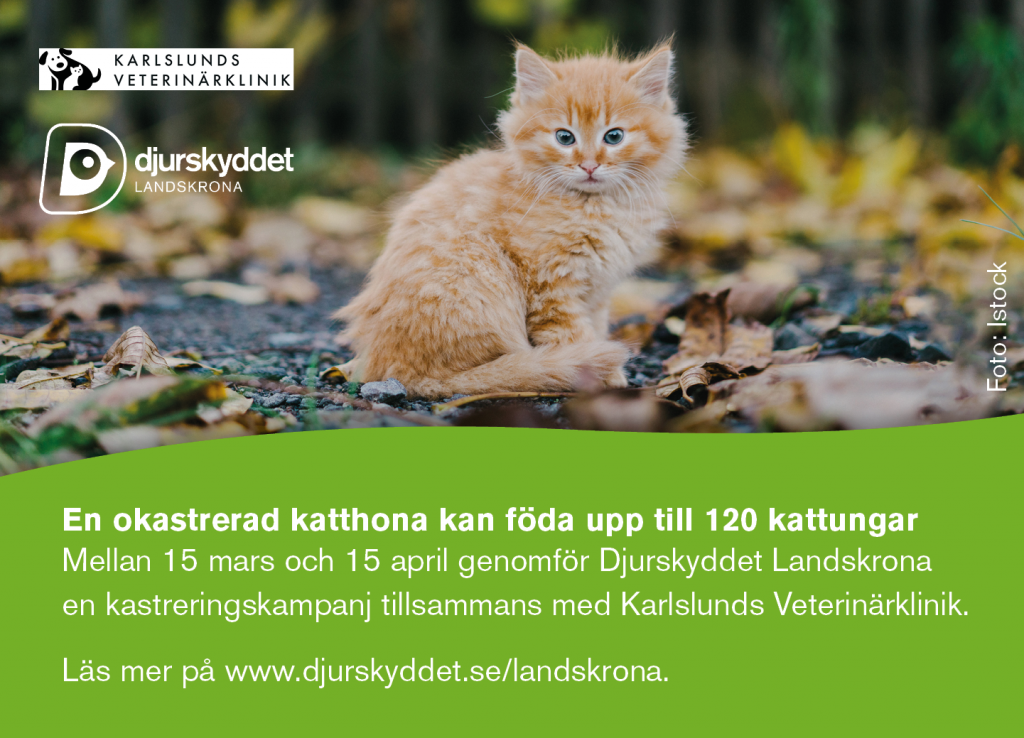 Mellan 15 mars och 15 april genomför vi en kastreringskampanj tillsammans med Karlslunds Veterinärklinik i Landskrona. De 40 första som kastrerar sin katt under denna tid får 50% rabatt på ingreppet. Gäller privatpersoner. Max 2 katter per hushåll.