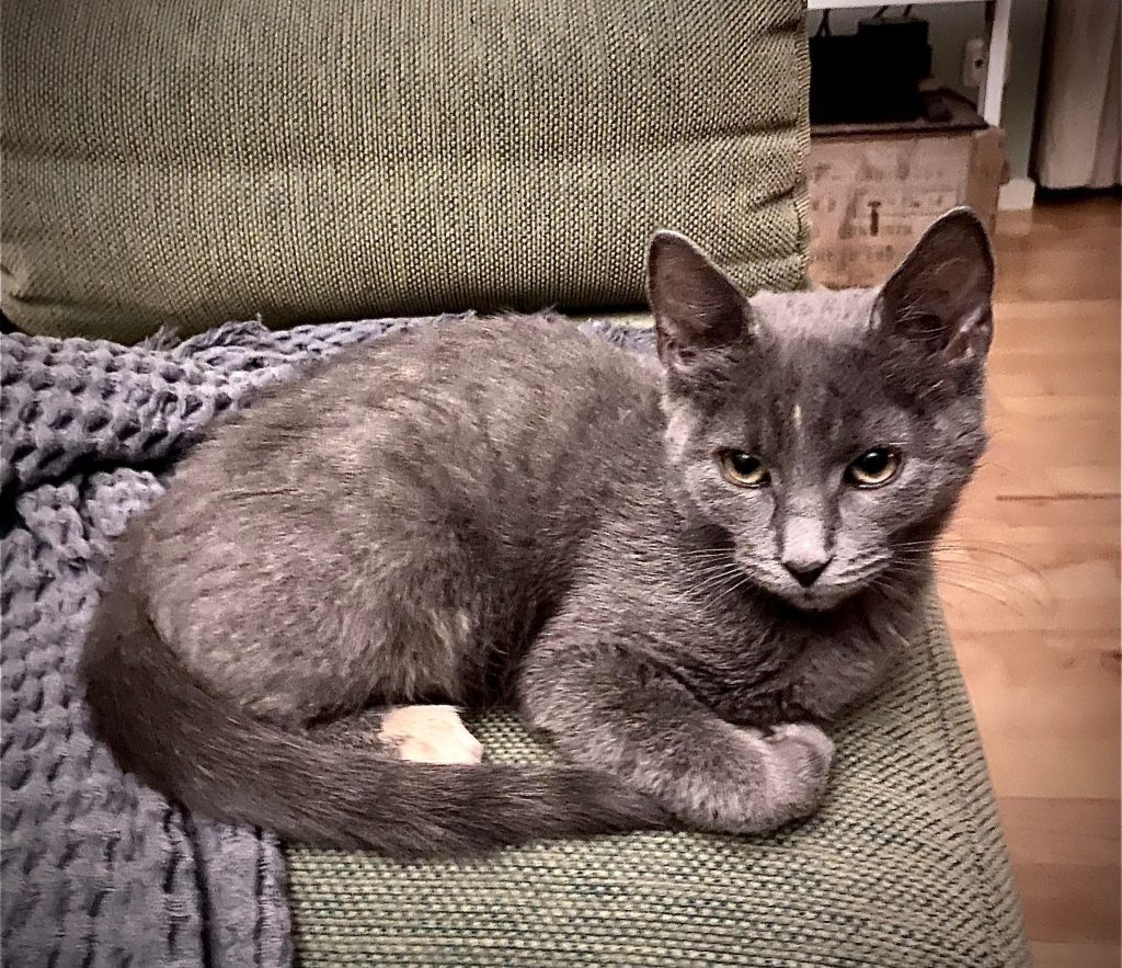 Justinas päls är nästan helt grå bortsett från några vita fläckar. Hon är en mycket smart nyfiken modig och kärleksfull katt.